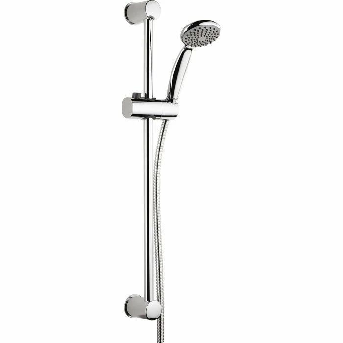 Douchette Boréal Ø 80 mm, 1 jet anti-calcaire, Barre inox Ø 19 mm, pieds ABS, curseur réglable et orientable, Déplacement du curseur par pression sur un bouton, Flexible double agrafage inox chromé 1,75 m, Entraxe fixation : 55,5 cm, Débit : 8,5 l/min sous 3,5 bar