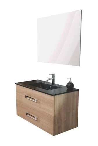 Vendu sans bonde ni robinet ni visserie de fixation murale. Dimensions caisson + plan vasque : L91,5 x H53 x P46,5 cm