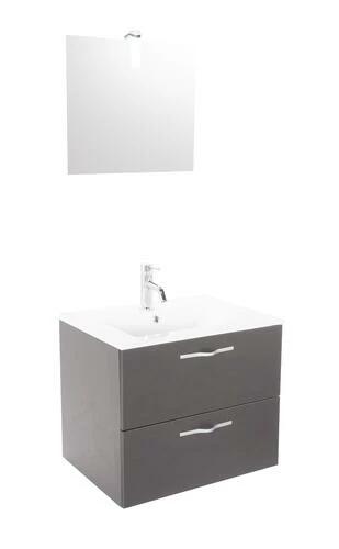 Meuble à suspendre collection OBVIO S+, un ensemble complet et un large choix de couleurs.Plan céramique 20mm – 2 Tiroirs à fermeture progressive – Miroir et Spot LED – Livré monté – One pack – Fabriqué en Europe – Largeur 60cm – Gris La gamme OBVIO S+ se compose d’un meuble à suspendre, associé à un miroir et un spot LED, en deux dimensions et d’une colonne à suspendre.Une large gamme de coloris pour des meubles livrés montés en one pack.Meuble à suspendre disponible en dimension 60cm avec vasque encastrée.Finition mélaminé gris.Poignées en métal chromé.Plan vasque céramique extra-plat 20mm, vasque moulée avec trop plein.Vasque simple.Miroir simple à suspendre.Un pot LED classe 2IP44, classe énergie A+, température de couleur 3000K, flux lumineux 200 lumens.Ampoule G9-3W fournie.Livré monté.One pack.Fabrication Européenne.
